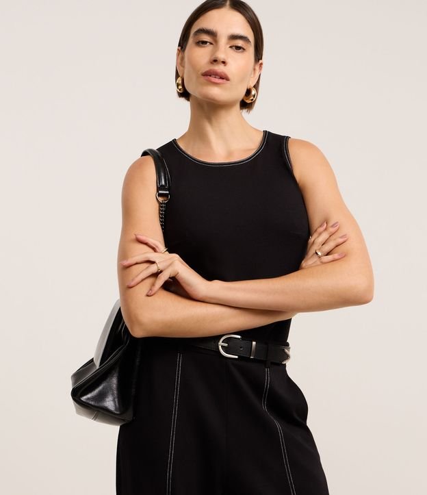 Blusa sem mangas, confeccionada em ponto roma com viscose mais sustentável, com rola redonda e alças largas. Peça tem costura em listras duplas na gola e nas alças.
