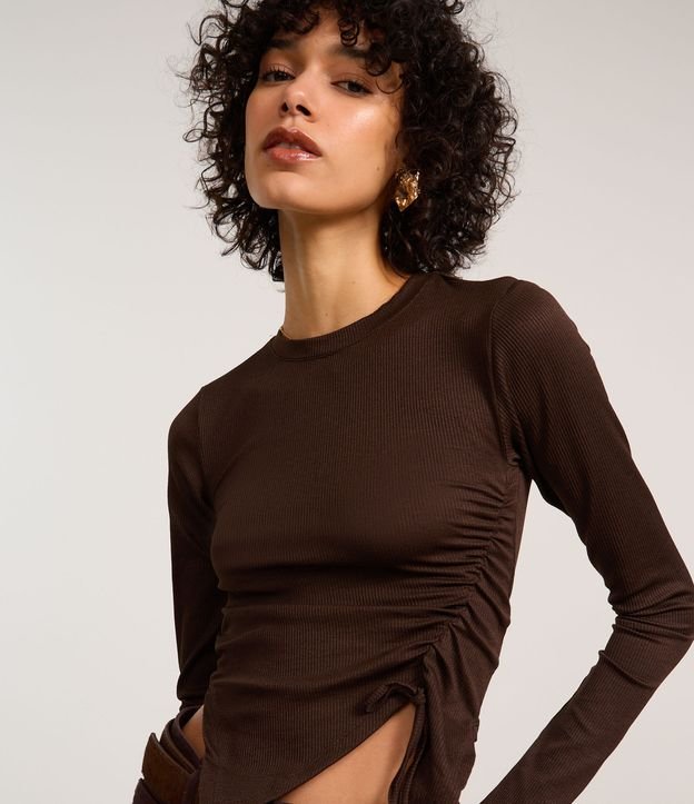 Blusa em Ribana com Barra Assimétrica e Puxadinho Lateral Marrom