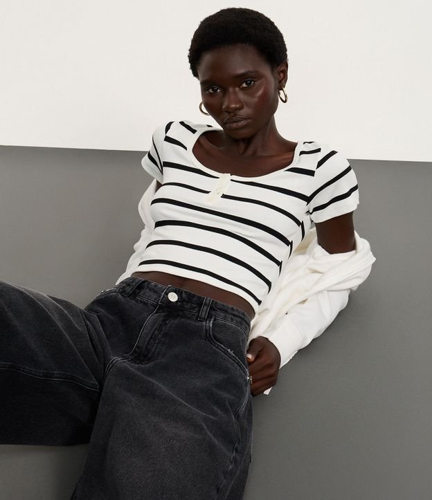 Blusa em Ribana com Decote Quadrado e Estampa de Listras Branco/Preto