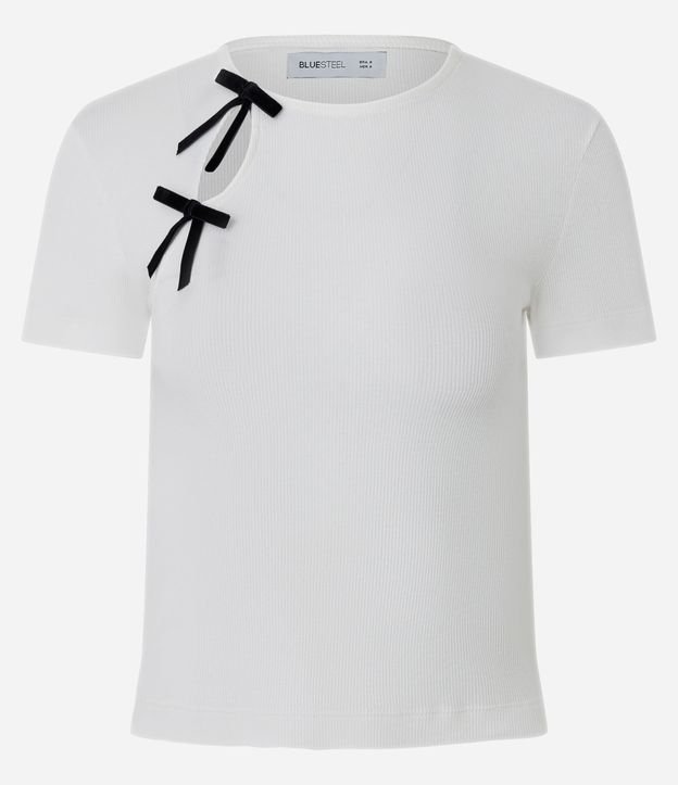 Blusa feminina confeccionada em ribana de algodão mais sustentável, com textura canelada e caimento ajustado ao corpo. O modelo de manga curta apresenta gola redonda e acabamento liso, com destaque para o aviamento de lacinhos aplicados na parte frontal próxima ao ombro, que adicionam delicadeza e um toque feminino ao visual. Versátil e confortável, é ideal para composições casuais com charme no dia a dia.