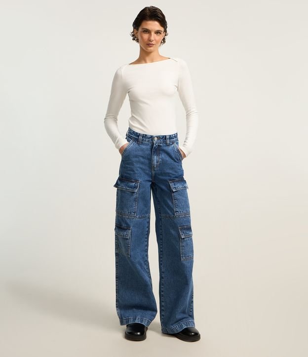 Blusa feminina, confeccionada em ribana, com gola canoa, detalhe sobreposto no ombro e superfície sem estampa.