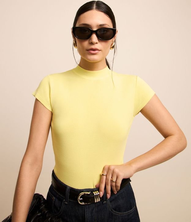 Blusa em ribana com golinha alta, manga curta e malha texturizada