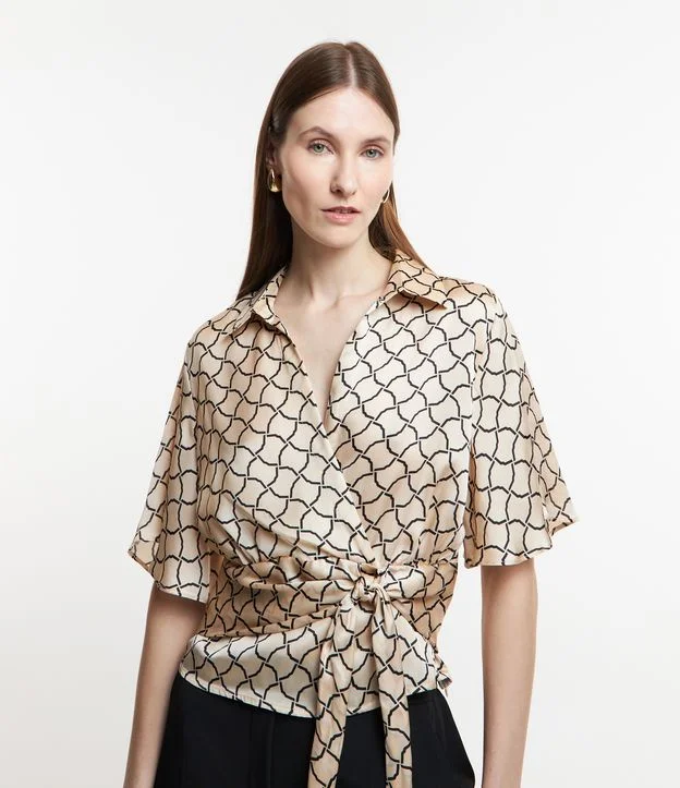 Blusa em Tecido Acetinado com Amarração e Estampa Geométrica Bege