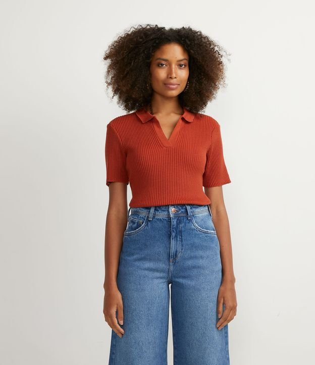 Blusa em Tricô Canelado com Gola Polo e Manga Curta