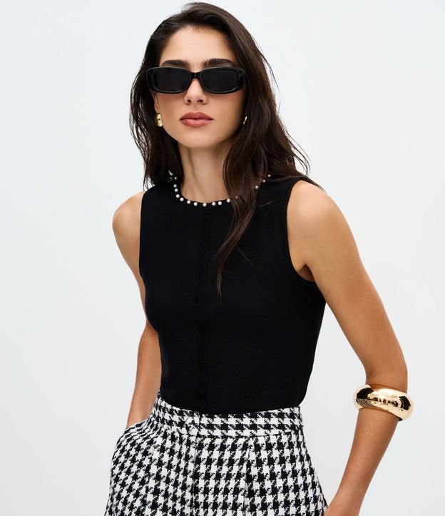 Blusa feminina sem mangas em tricô com modelagem reta, comprimento curto, decote redondo com aplicação de pérolas.