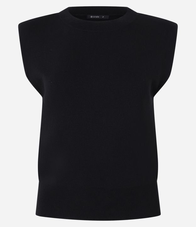 Blusa feminina confeccionada em tricô, com gola redonda, sem mangas e barra ajustada.