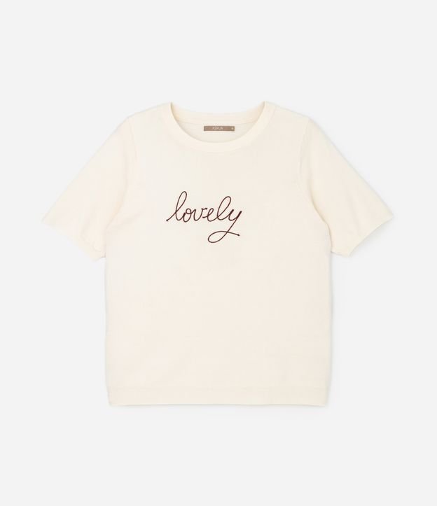 Blusa feminina confeccionada em tricô mais sustentável. Possui gola redonda, manga curta, bordado lettering "Lovely" e barra retilínea.