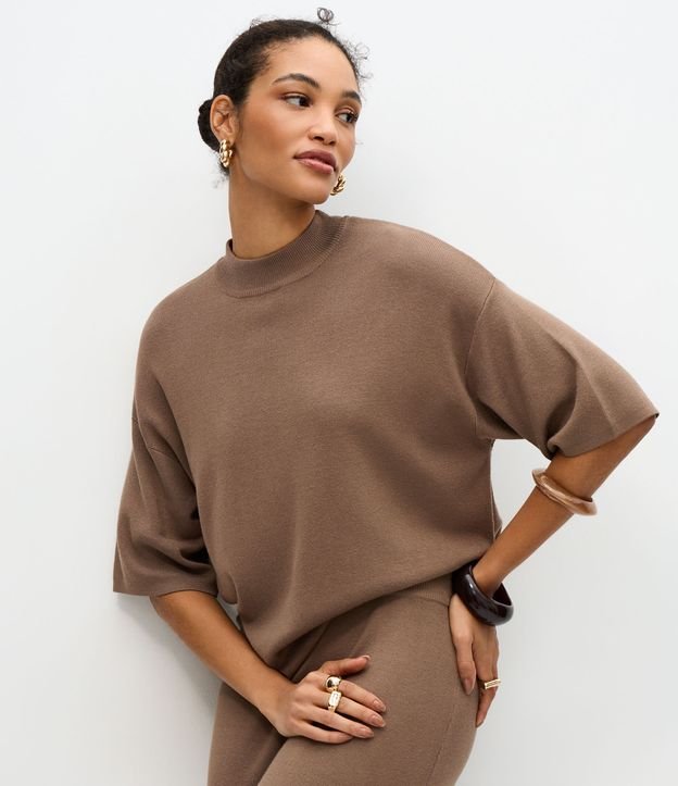 Blusa em Tricô com Cava Deslocada e Manga Ampla Marrom