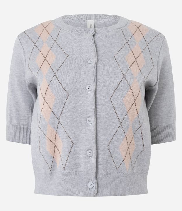 Blusa em Tricô com Estampa Geométrica e Botões Frontais Cinza