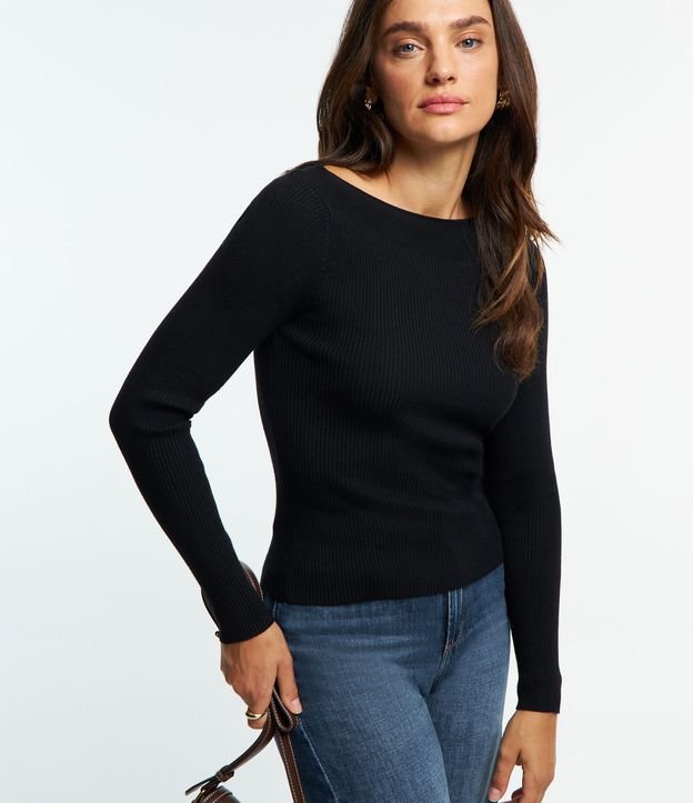 Blusa em Tricô com Gola Canoa e Textura Canelada Preto