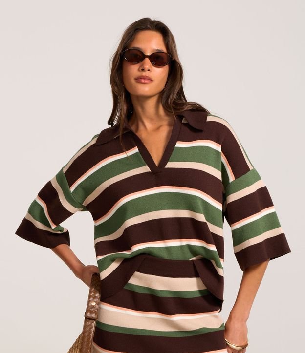 Blusa em Tricô com Gola Polo e Listras Variadas
