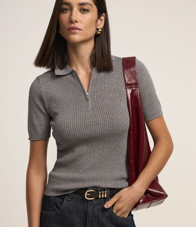 Blusa com golinha polo, manga curta, confeccionada em tricô leve e com meio zíper frontal.