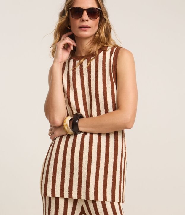 Blusa sem mangas, confeccionada em tricô, com gola redonda. Peça bicolor com listras verticais. Este produto possui poliéster reciclado em sua composição, além de ter sido produzido através de processos mais sustentáveis com boas práticas ambientais, sendo ambientalmente mais responsável.
