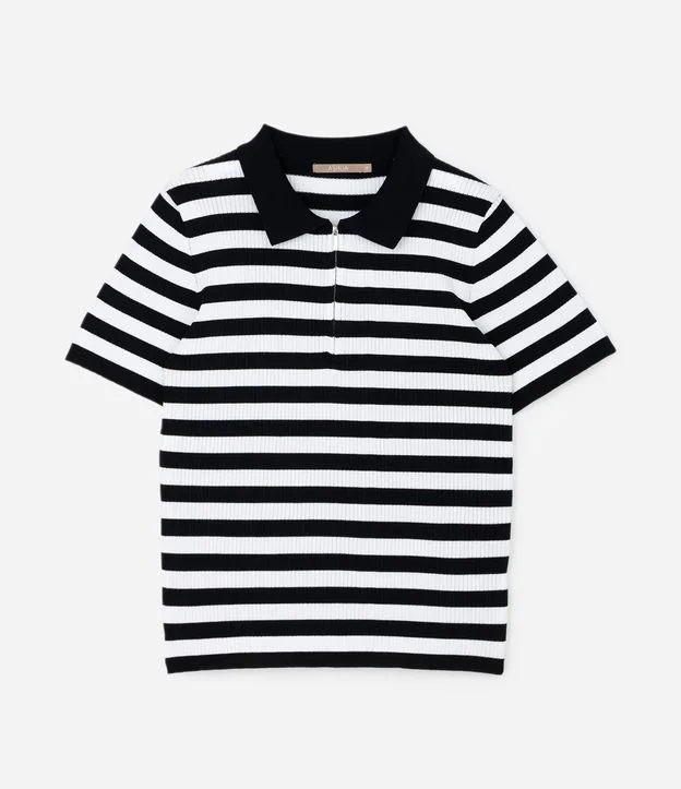 Blusa plus size confeccionada em tricô leve, com gola polo de zíper e mangas curtas. Possui textura caneladinha e padronagem de listras.