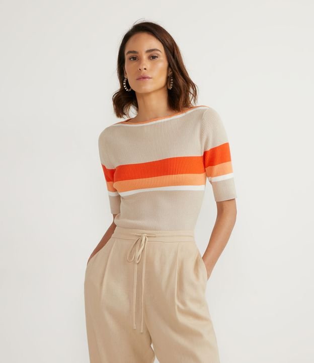 Blusa em Tricô com Manga Curta e Estampa de Listras