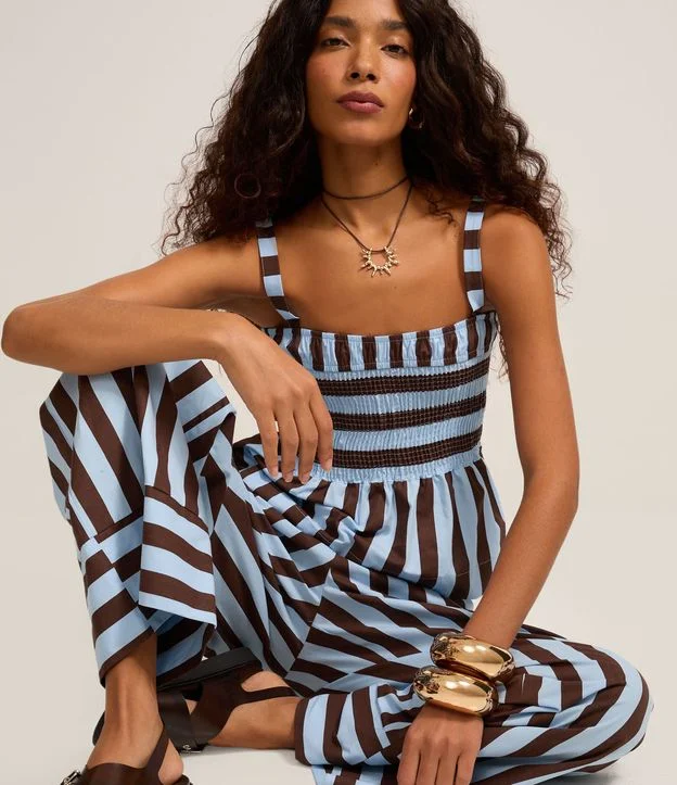 Blusa em Tricoline com Alça Larga e Listras Azul/Marrom