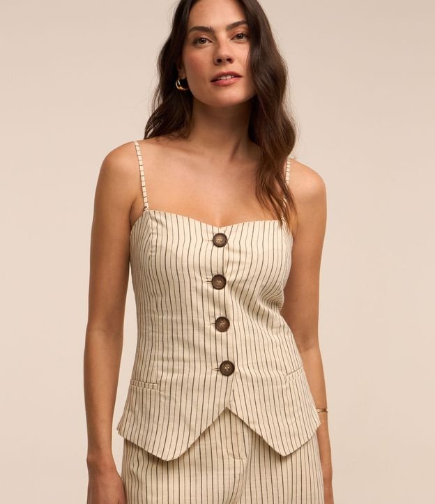 Blusa em Tricoline Listrado com Alcinha Removível e Abotoamento Frontal Off White