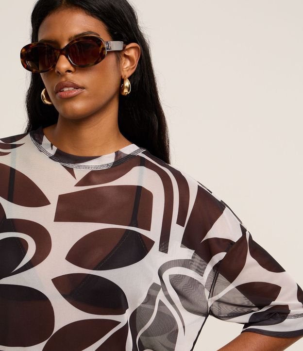 Blusa de mangas curtas, confeccionada em tule, com gola redonda. detalhes com costura aparente na manga e na barra, além de estampa abstrata. Peça bicolor.