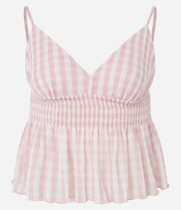 Blusa em Tule com Decote em V Alças Finas e Xadrez Vichy