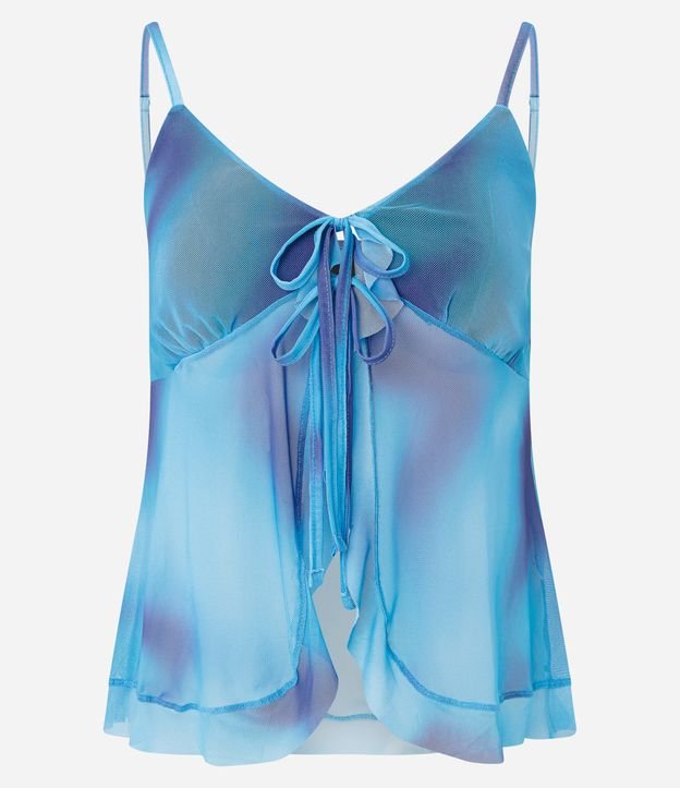 Blusa em Tule com Estampa Abstrata e Amarração Frontal Azul
