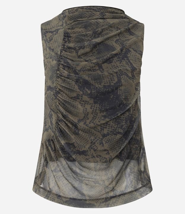 Blusa feminina sem mangas em tule, com estampa animal print que reproduz textura de cobra. Possui drapeados nas laterais, barra levemente arredondada e transparência, criando um visual marcante.