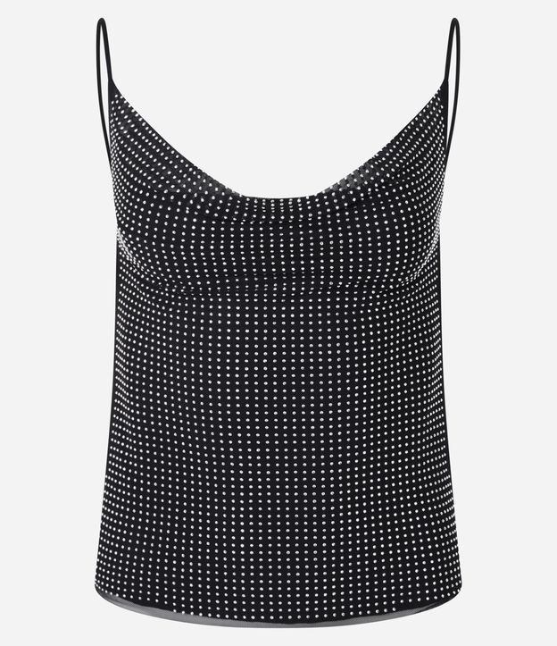 Blusa sem mangas, de alças finas em tule metalizado e decote degagê.