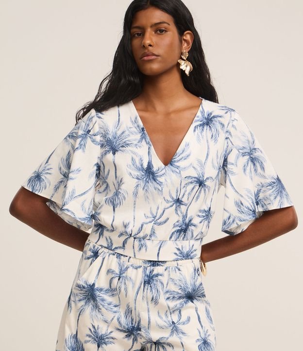 Blusa em Viscolinho com Estampa Coqueiros e Decote V Azul/Off White