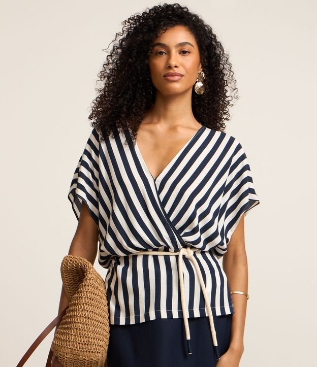 Blusa manga curta com decote v transpassado, confeccionada em listras largas e cintinho de corda na cintura.