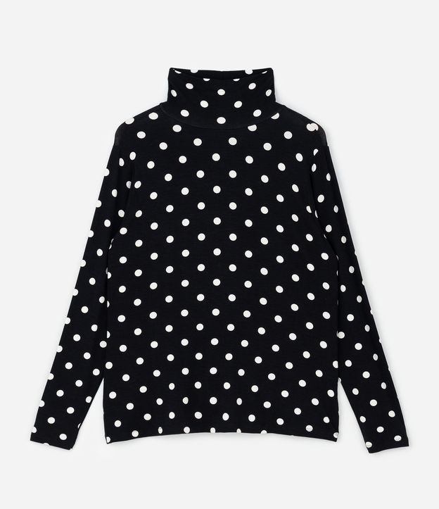 Blusa feminina, confeccionada em viscolycra, com golinha alta, mangas longas e estampa poá.