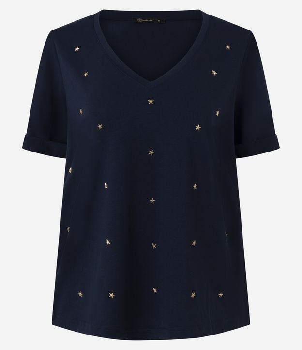 Blusa em Viscolycra com Ícones Metalizados Azul Marinho com Estrelas