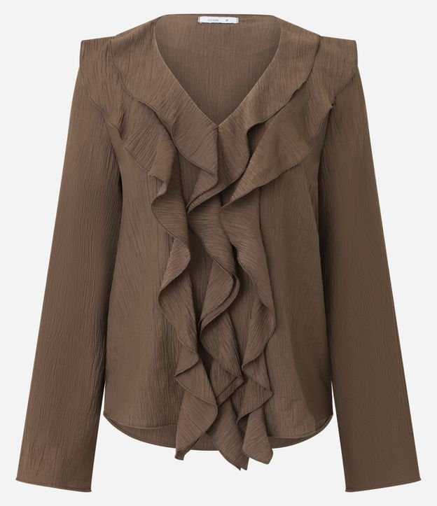 Blusa feminina de manga longa confeccionada em viscose mais sustentável. Possui decote em V, babados do decote até a barra, modelagem solta e caimento leve.