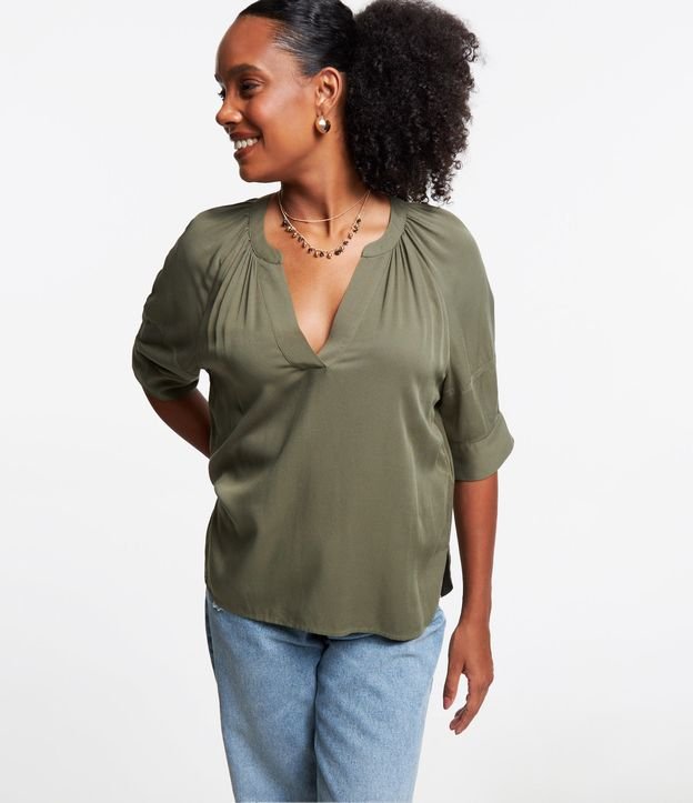 Blusa em Viscose com Decote V e Detalhe Franzido Verde
