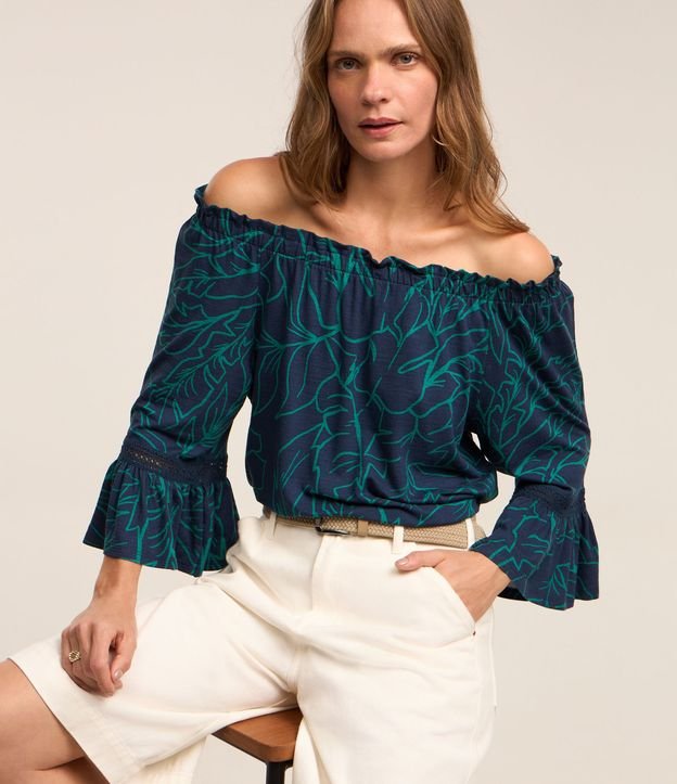 Blusa feminina, confeccionada em viscose, com decote ombro a ombro, mangas longas com detalhe e estampa folhagens.