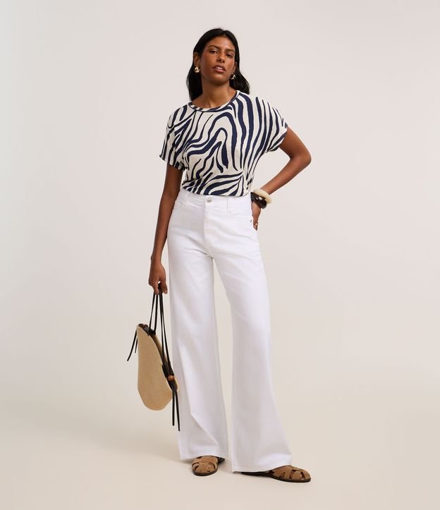 Blusa em Viscose com Estampa Zebra e Gola Redonda Azul/Off White