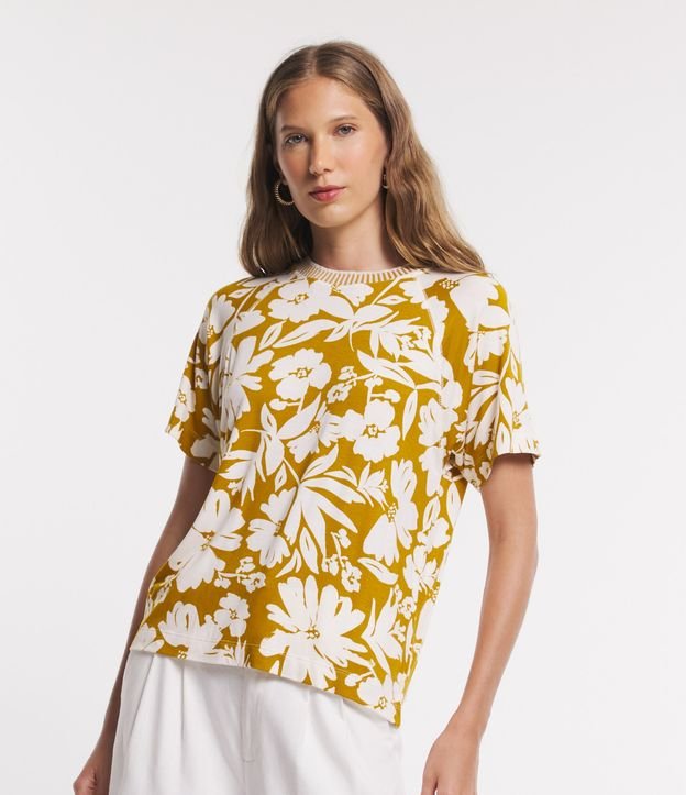 Blusa em viscose com Gola Texturizada e Estampa Floral Contrastante