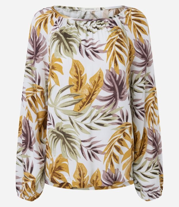 Blusa em Viscose com Manga Bufante e Estampa de Folhagens Off White