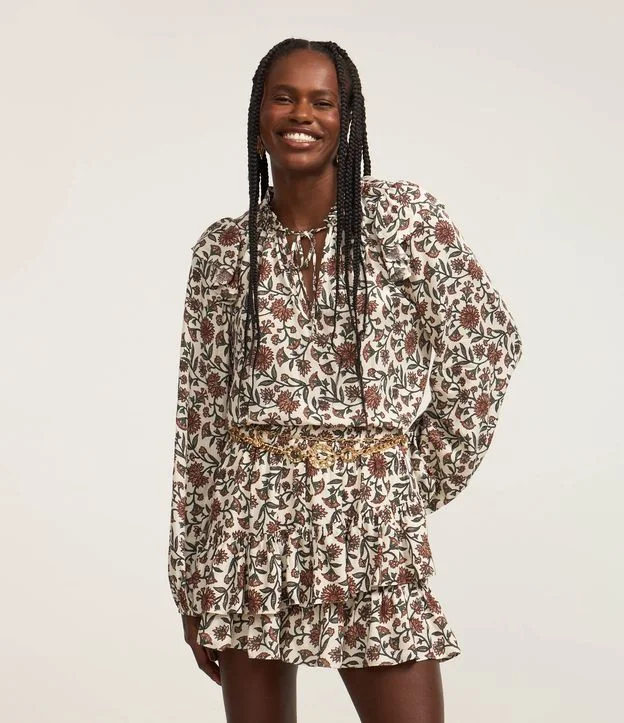 Blusa feminina confeccionada em viscose mais responsável, de modelo over, com gola altinha e mangas longas bufantes. Possui amarração na gola, babados nos ombros e estampa floral.