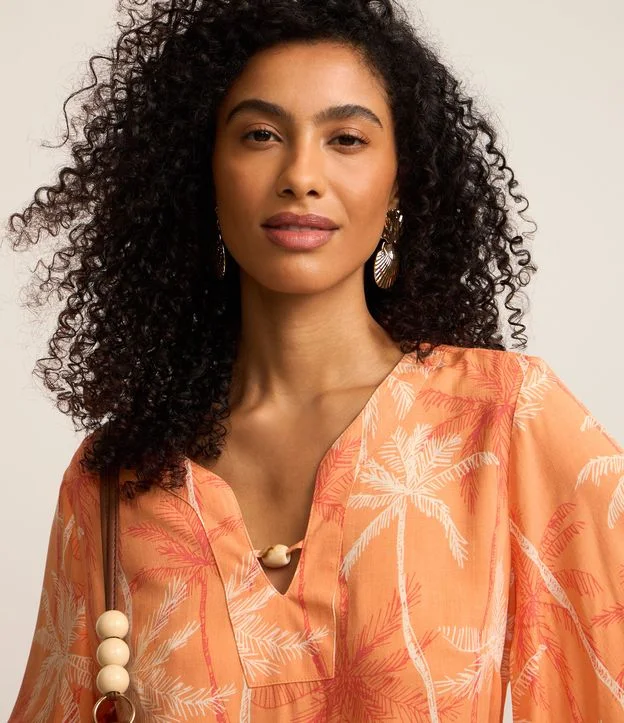 Blusa em Viscose com Miçanga na Gola e Coqueiros Estampados Laranja