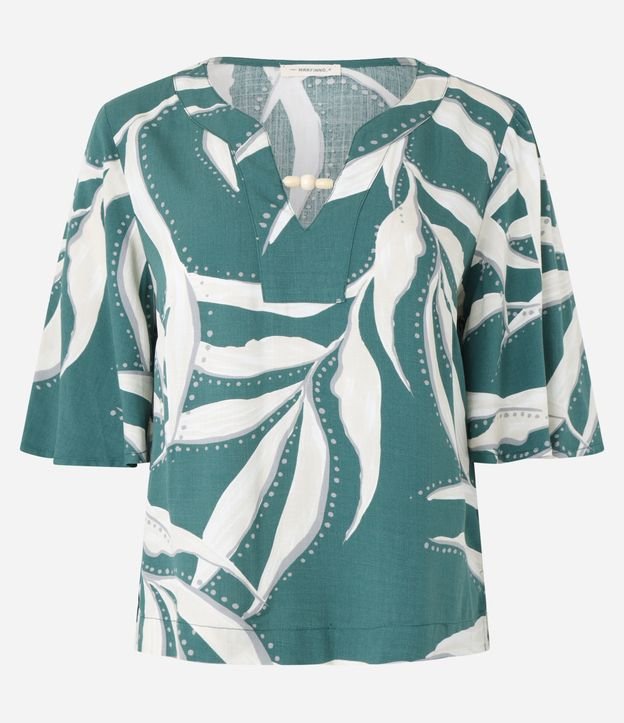 Blusa em Viscose Decote em V com Aviamento e Estampa Folhagem Verde/Branco