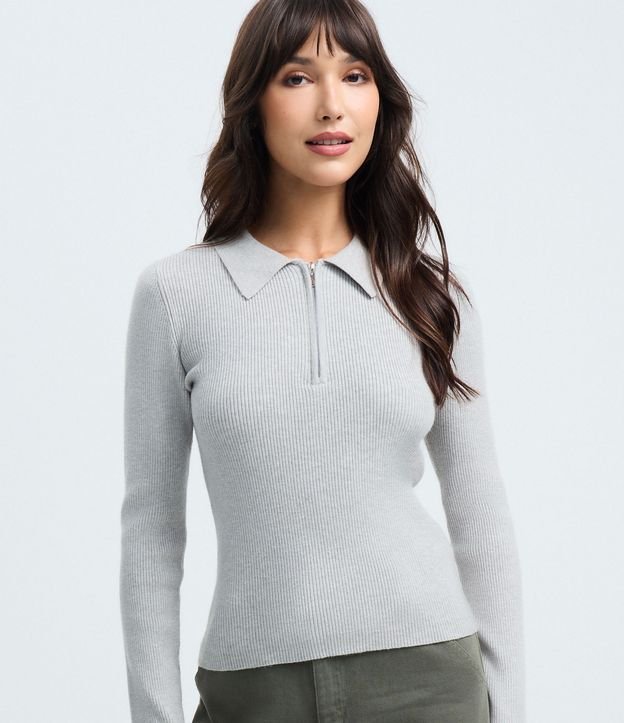 Blusa em Viscose em EfeitoTricô com Gola Polo e Zíper Cinza