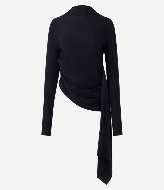 Blusa Feminina Manga Longa Gola Alta com Drapeado Assimétrico Preto