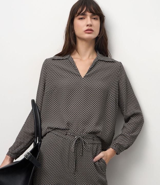 Blusa feminina confeccionada em chiffon, com manga longa, decote em V estilo polo e estampa fullprint de mini pied-de-poule, ideal para composições elegantes e versáteis no dia a dia.