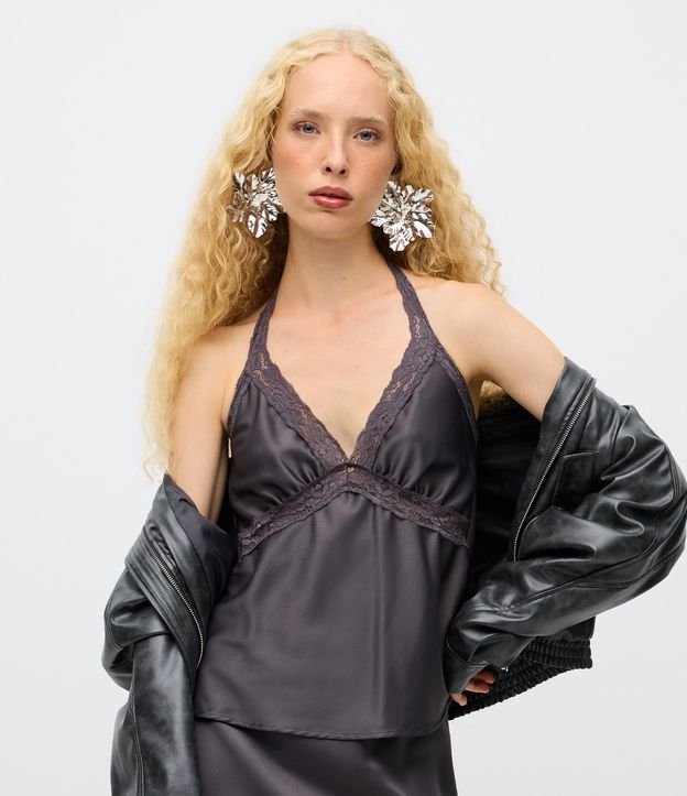 Blusa Frente Única Acetinada com Renda Cinza