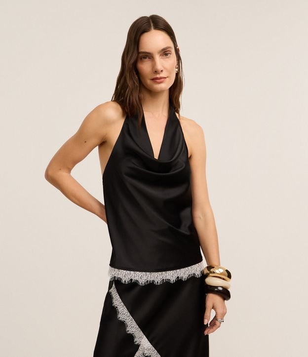 • Blusa Frente Única em Cetim com Decote Degagê com Renda na Barra Preto 1
