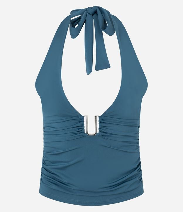 Blusa feminina confeccionada em microfibra, no modelo frente única. Possui amarração no pescoço, aviamento no decote e franzidos.