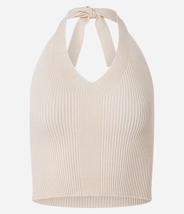 Blusa feminina confeccionada em tricô através de boas práticas ambientais, no modelo frente única. Possui decote v, amarração no pescoço, sem mangas, com textura e sem estampa.