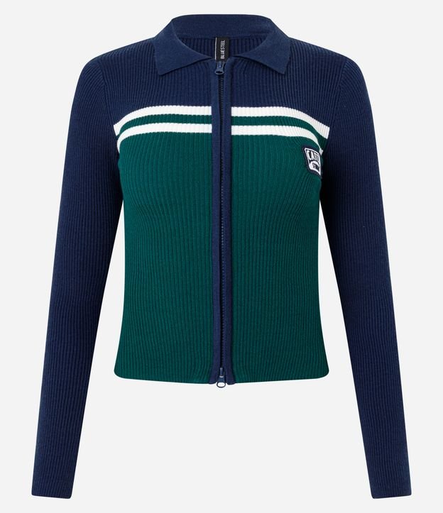 Blusa Gola Polo em Tricô com Estampa Náutica e Zíper Azul / Verde