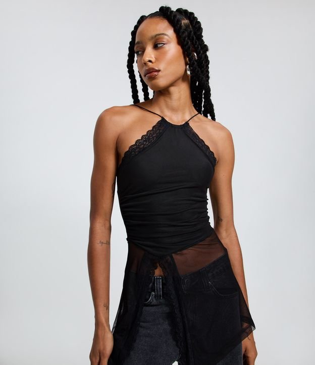 Blusa Halter em Tule com Renda Aplicada Preto