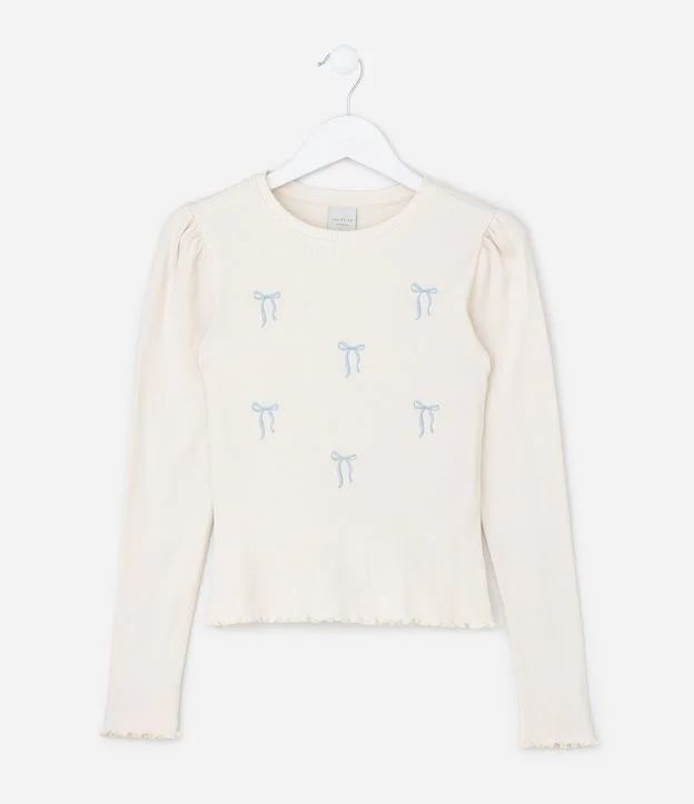 Blusa infantil com modelo baby look, confeccionada em ribana de algodão certificado BCI, com superfície canelada e toque macio. Possui gola redonda, mangas longas com leve franzido nos ombros e bordado localizado de laços delicados, trazendo visual atual e delicado para o dia a dia.