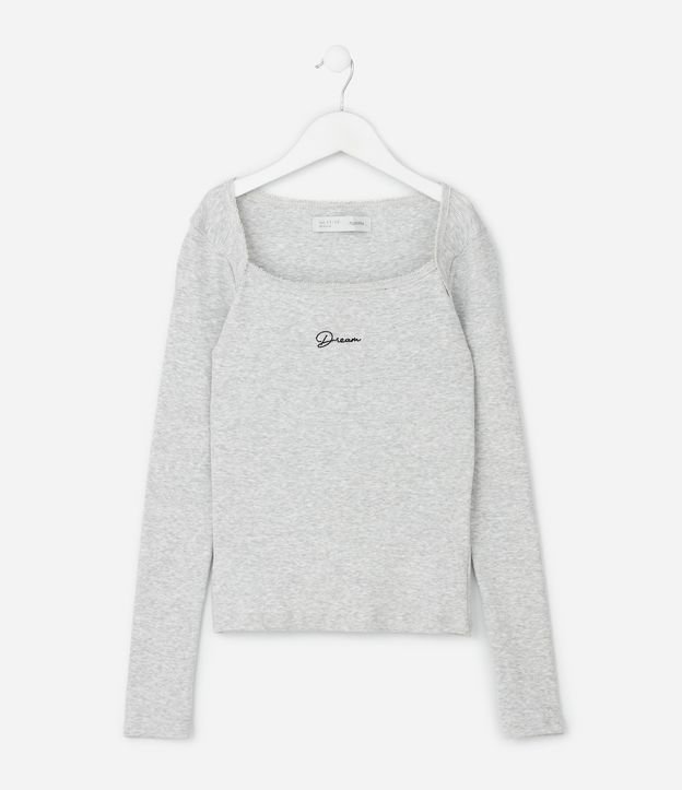 Blusa infantil com modelo baby look, confeccionada em ribana de algodão certificado BCI, com superfície canelada e toque macio. Possui decote quadrado, mangas longas ajustadas ao corpo e bordado lettering localizado, trazendo visual atual e delicado para compor looks do dia a dia.
